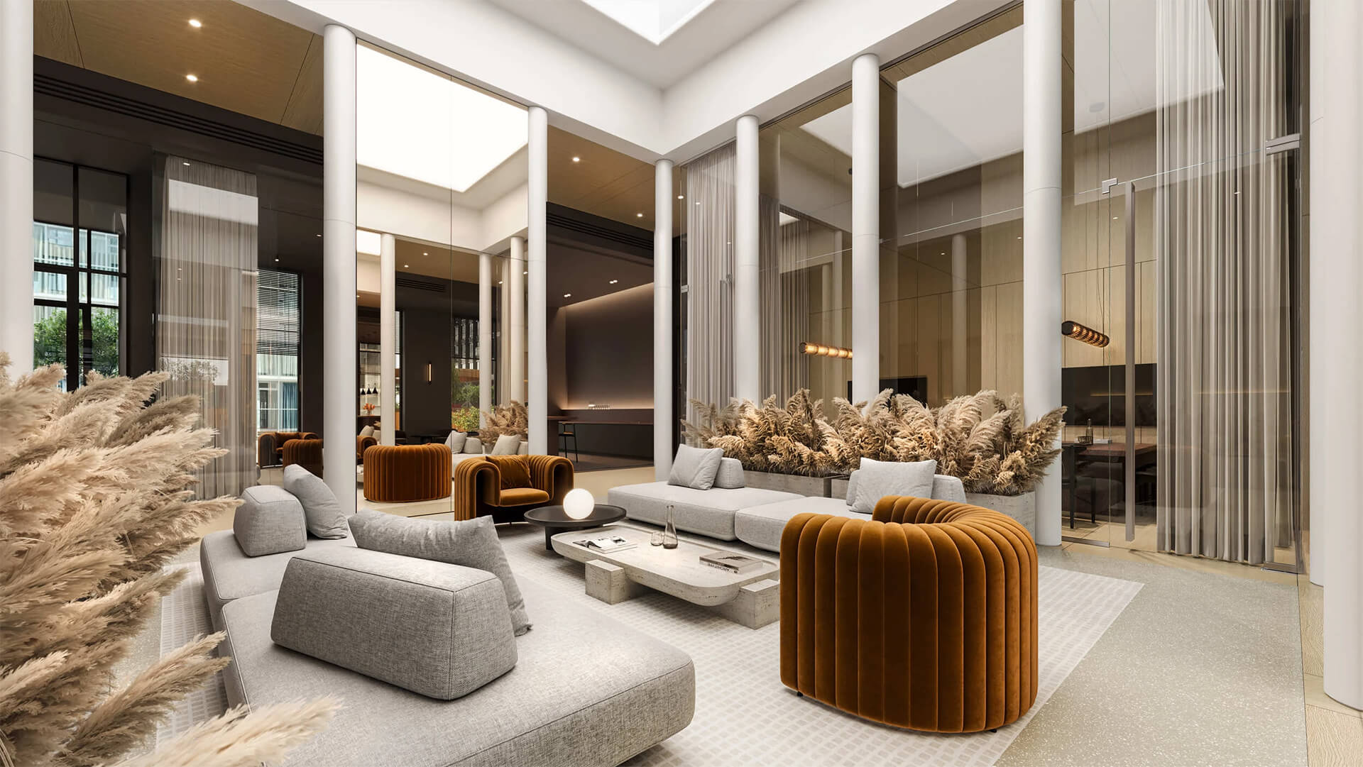 Лобби жилого комплекса «Среда на Лобачевского» задумывались как места, где встречаются эстетика, комфорт и функциональность. Пространства оформлены в современном стиле и создают первое впечатление о проекте. Высокие потолки, большие окна и качественные материалы отделки формируют ощущение простора и света. Лобби выполняют роль визитной карточки дома, где каждый элемент интерьера работает на общее впечатление: мягкая мебель, лаунж-зоны, стильные светильники и декоративные элементы делают пространство уютным и функциональным.