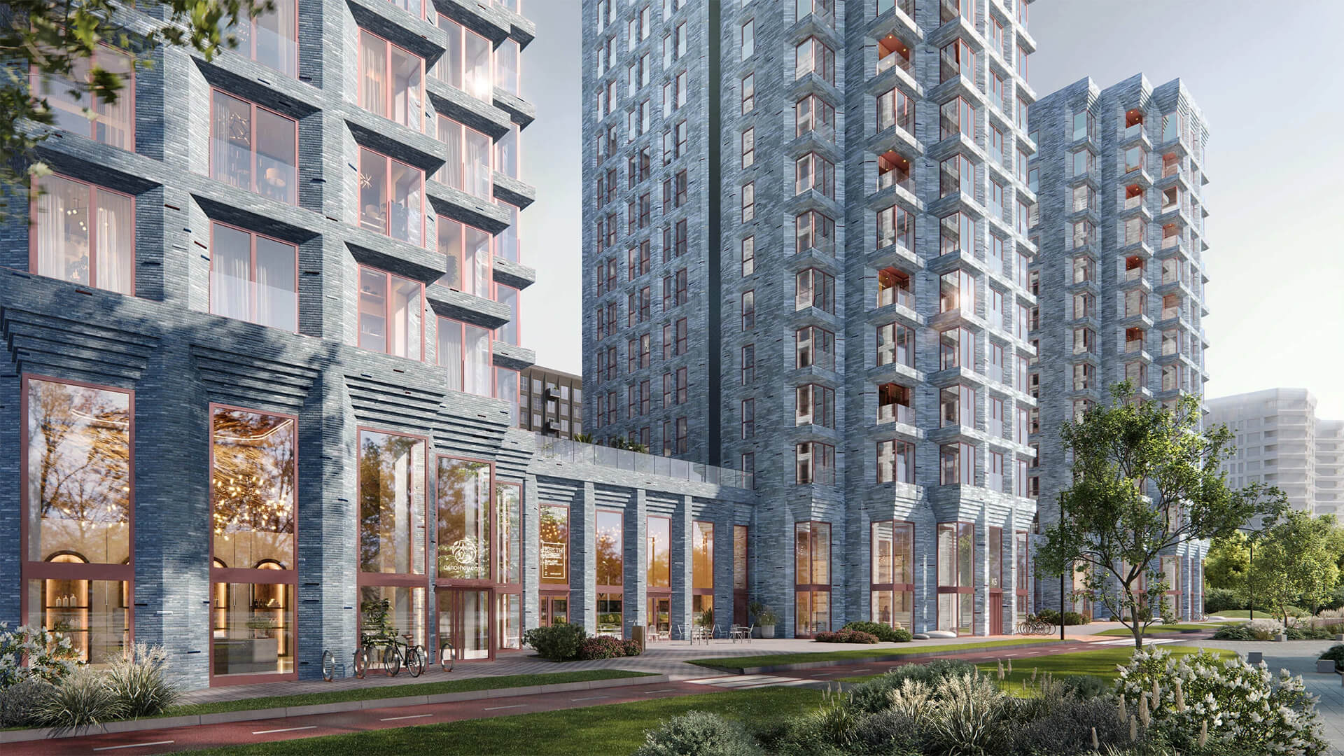 Архитектурную идею разработало бюро Saga, предложившее вариативность корпусов от 4 до 27 этажей. Такая структура придаёт ансамблю динамичный силуэт, открывает доступ солнечному свету и создаёт приватность во дворе. Фасады выполнены из аквамаринового ригельного кирпича, который стал выразительным акцентом в облике всего комплекса. Контраст материалов и тонов придаёт зданиям индивидуальность, но в то же время поддерживает целостность образа. Жилые дома формируют внутренний квартал, защищённый от городского шума, и создают ощущение уюта и приватности.